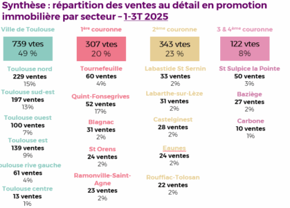 Toulouse concentre encore 50% des mises en vente et des ventes de l’aire urbaine seulement. La 1ère et la 2ème couronne représentent 43% des volumes, quand les 3e et 4e couronnes comptabilisent 122 ventes soit 8% des ventes de l’aire urbaine (ex. 50 ventes à Saint-Sulpice-La-Pointe et 27 à Baziège).